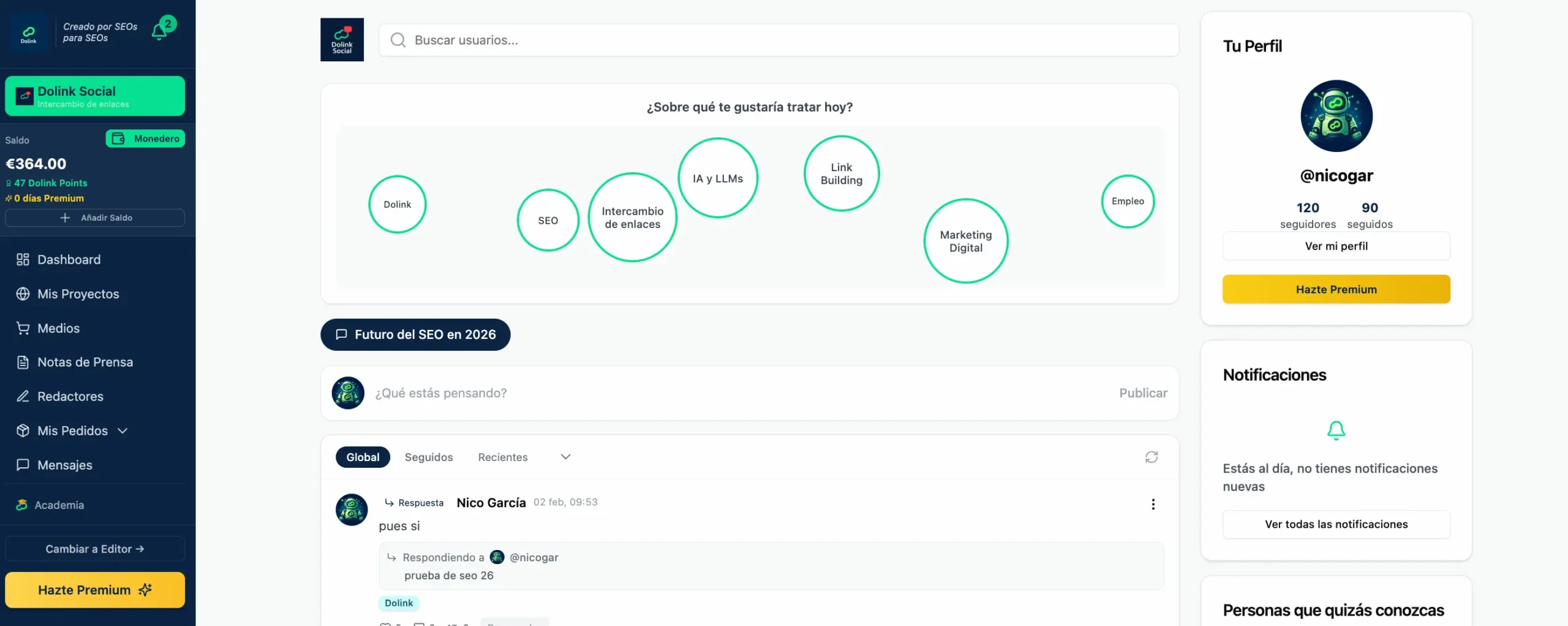 Dolink Social, la nueva red social privada diseñada exclusivamente para profesionales del SEO y el marketing digital que buscan un entorno especializado. En este espacio, podrás gestionar intercambios de enlaces y acceder a ofertas de empleo exclusivas, además de debatir sobre la actualidad del sector y forjar una red de contactos